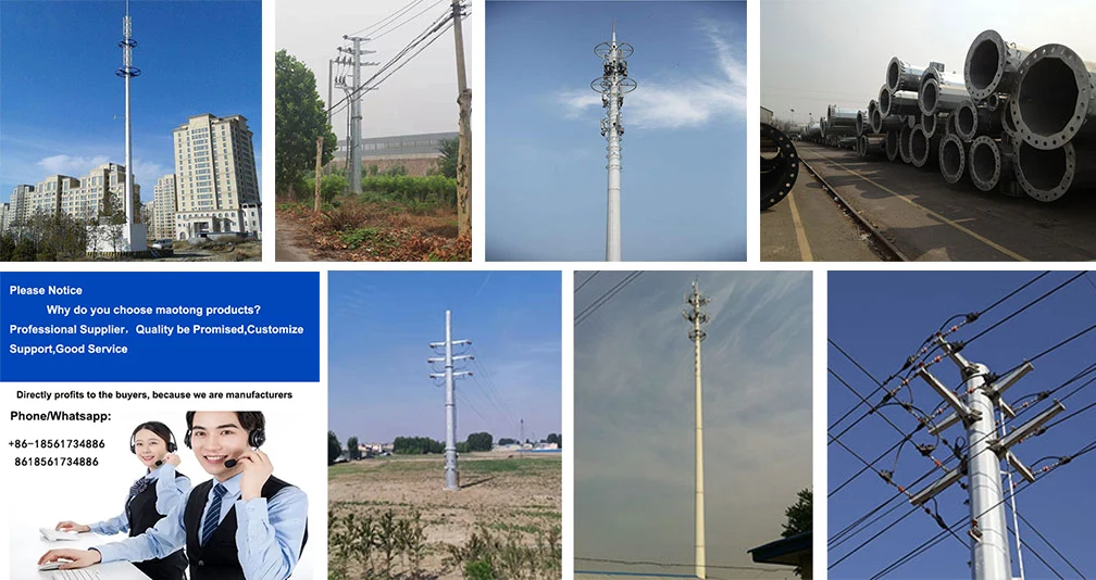 Jako profesjonalni producenci, Mao Tong chciałby dostarczyć jednobiegunową wieżę elektryczną z jednobiegunową transmisją 10KV. A my zaoferujemy Ci najlepszą obsługę posprzedażną i terminową dostawę. Pojedyncza wieża odnosi się do pojedynczej rury stalowej składającej się z wolnostojącej konstrukcji wieżowej do komunikacji bezprzewodowej, jej głównym korpusem jest spawana rura stalowa o przekroju okrągłym lub wielokątnym, określana jako pojedyncza wieża. Materiał korpusu wieży z pojedynczą rurą Q345B, inne materiały pomocnicze Q235B, korpus wieży to konstrukcja z czystej stali, bez upiększania i modelowania kamuflażu. Typowym kształtem wieży jest typ wtykowy, zewnętrzny wspornik wspinaczkowy, typ kołnierza wewnętrznego/zewnętrznego i tak dalej