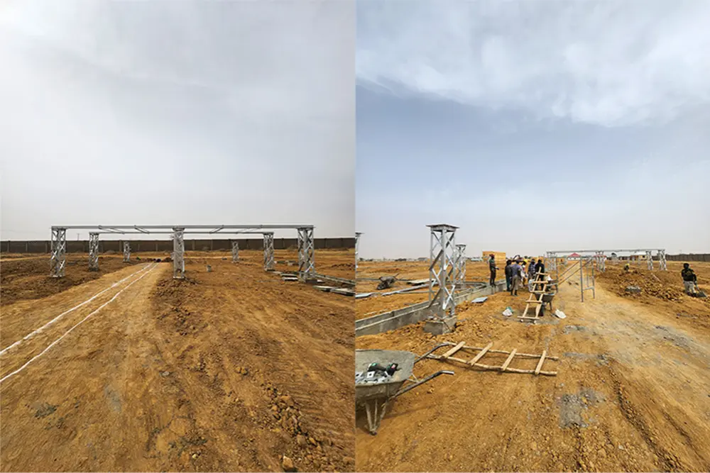 Nawet przy lokalnej temperaturze sięgającej 35,6 stopnia Celsjusza załoga porusza się szybko. Elementy ze stali ocynkowanej znajdują się teraz na ziemi i są gotowe do umieszczenia na miejscu. Konstrukcje te są zbudowane tak, aby sprostać dużym wymaganiom podstacji 330 kV i zapewnić długoterminową stabilność lokalnej sieci energetycznej.